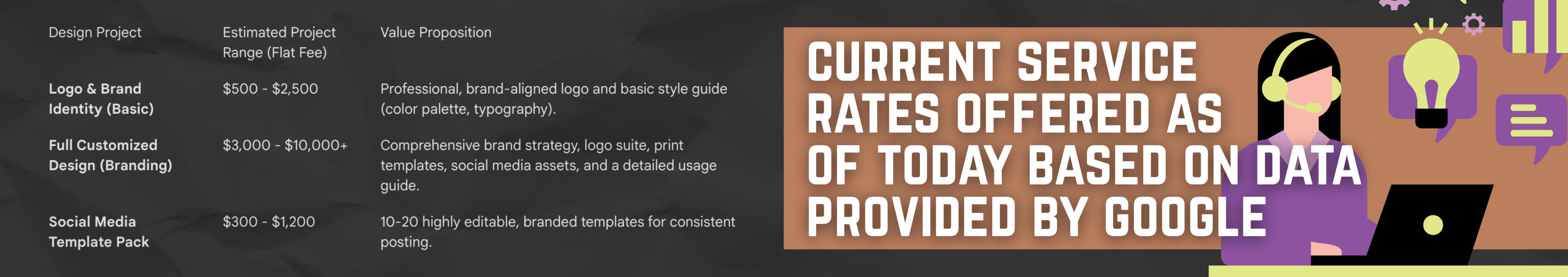 For a new business looking for a graphic designer, pricing is often fixed based on the deliverable.